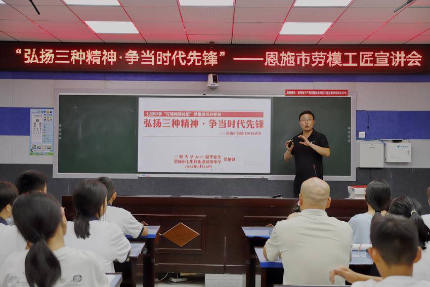 6月16日,由恩施市总工会、恩施市七里坪街道初级中学联合主办的“劳模工匠进校园”暨“硒都名师进校园 感悟诗词助成长”梦想读书会在七里坪街道初级中学举行。